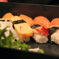 Japanischer Sushimeister bietet Sushispezialitäten, Bentoplatten und japanische Weine in belebtem Restaurant.